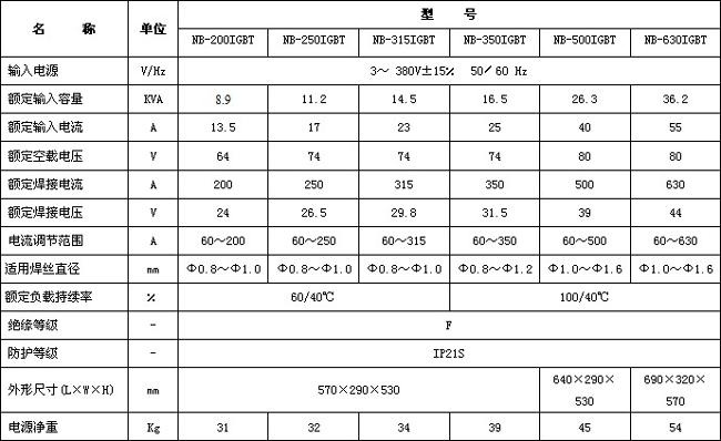 NB-200、250、315、350、500、630IGBT逆變式氣體保護焊機 主要特點: 1. IGBT模塊、快恢復二極管、集成電路、繼電器等關鍵元器件均采用世界頂級名牌產品; 2. 采用軟開關技術,改善了IGBT管的工作條件,極大提高了焊機 的可靠性; 3. 環境溫度40℃,100%負載持續率; 4. 動特性好,電弧十分穩定,焊縫成型美觀、飛濺小; 5. 電源為多特性、多用途設計,手工焊特性優異;NB-630IGBT可做碳弧氣刨; 主要技術參數: